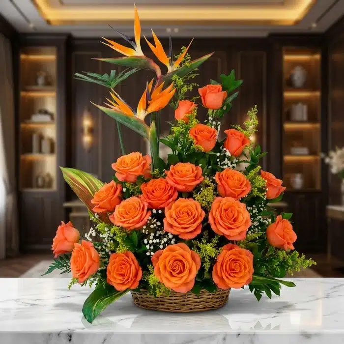 The elements that make up the Exotic Splendor Floral Arrangement such as bases, decorations, boxes, wines, chocolates, balloons, stuffed animals, flowers, fruits and colors, may differ from the reference image, and these are subject to any changes required. depending on availability, however we do our best to please our customers even in the smallest details.
