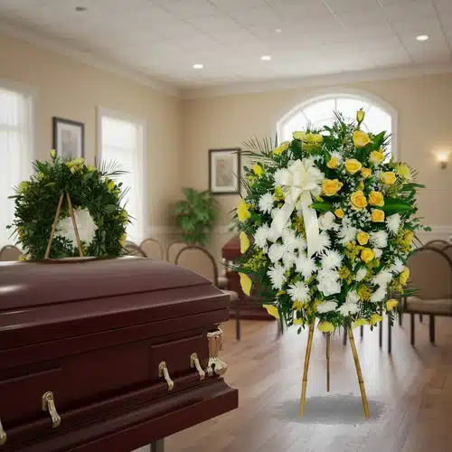 This elegant Funeral Wreath We Are With You on a bamboo tripod is made with