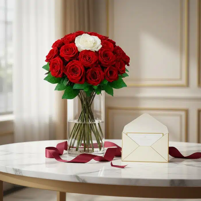 Arreglo Floral ALESSIA: 23 Rosas Rojas y 1 Blanca Inolvidable 🤍