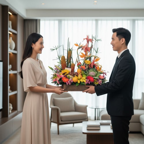 El Arreglo Floral con Frutas Hawai combina la belleza de las