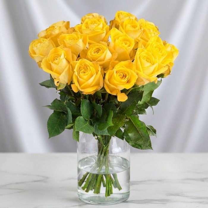 🎁 Imagina la sonrisa de esa persona especial al recibir este arreglo floral que irradia pura alegría. Dieciocho rosas amarillas de un color vibrante llenan el ambiente con su aroma fresco, transmitiendo gratitud y amistad en cada pétalo. Es un detalle perfecto, un verdadero rayo de sol para iluminar el día de quien más quieres.