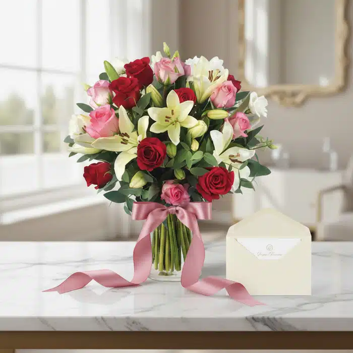 Jarron Floral GIORGIA: Elegancia en Rosas Rojas, Rosadas y Lirios 🌹