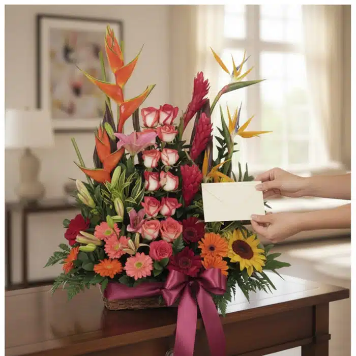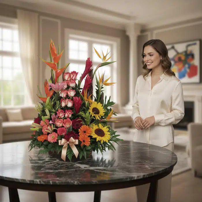 Celebra cada momento con la magia de flores exóticas y la ternura de las rosas. ✨ Un diseño vibrante y sofisticado, ideal para sorprender.