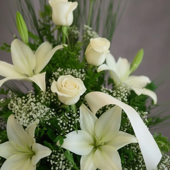 Con el Arreglo Fúnebre Descanso Eterno llena el ambiente de paz, armonía y serenidad enviando esta hermosa combinación de lirios blancos, rosas blancas y hojas verdes.