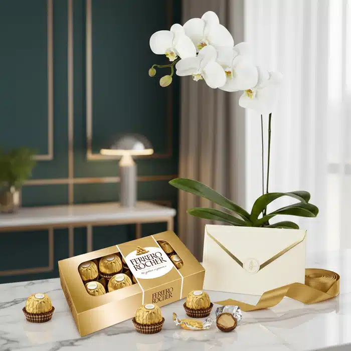 ¡La elegancia de una orquídea y la dulzura del chocolate para iluminar su día! ✨ Expresa tus mejores sentimientos con este regalo inolvidable.