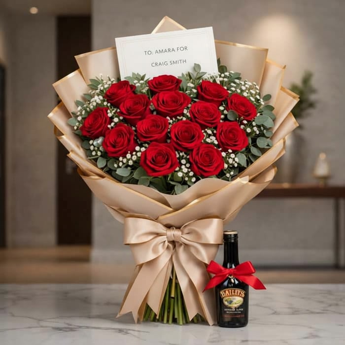 Envíale este espectacular ramillete de mano o bouquet de 12 rosas y follajes verdes (sin base) acompañado de una Botella de Baileys de 375ml y déjalo sin palabras.