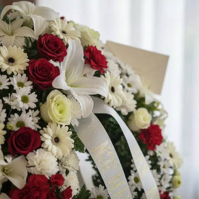 - Cinta Personalizada Incluida: Imprimimos su nombre, el de su familia o empresa en una cinta solemne, para que su presencia se sienta. 🙏