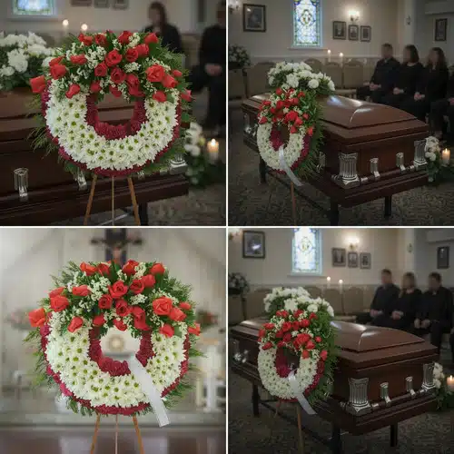 Honre la memoria de su ser querido con la Corona Fúnebre Adiós Sincero, finamente elaborada con margaritas, aplique en rosas rojas y finos follajes verdes.