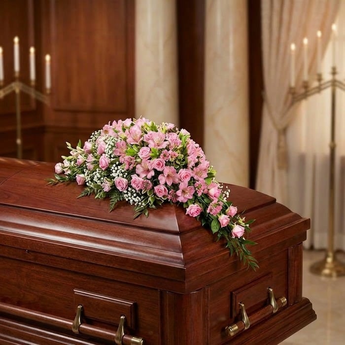 En estos momentos tan delicados, un gesto de cariño puede ser el mayor consuelo. Nuestro cubre cofre, tejido con la ternura de las rosas rosadas y la pureza de los lirios, es más que una ofrenda floral; es un abrazo cálido que honra una vida y acompaña a sus seres queridos en su despedida. 🤍