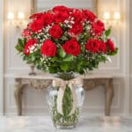 Cada vez que desees expresar tu amor regala rosas rojas, que mejor que este bello y elegante diseño floral elaborado sobre un jarrón de vidrio con