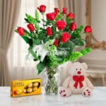 - Una caja de chocolates Ferrero Rocher por 8 unidades y un oso de peluche.