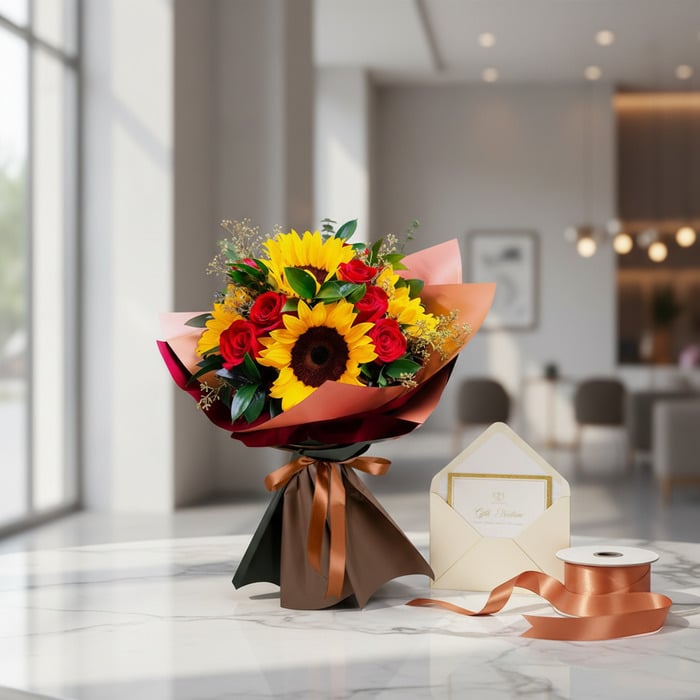 🎁 ¡Imagina la alegría de recibir este espectacular ramo de rosas y girasoles! Siente la combinación perfecta entre la pasión de 12 delicadas rosas y la energía radiante de 5 vibrantes girasoles. Un estallido de color y aroma fresco que ilumina cualquier espacio y corazón, ideal para expresar tus sentimientos más profundos.
