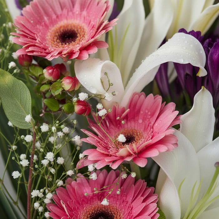 Bouquet de Flores GIA: Armonía de Gerberas Rosadas, Lirios y Flores Moradas 🕊️