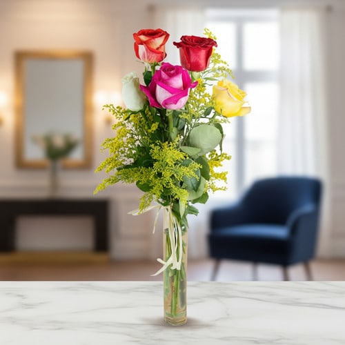 Sorprende a ese ser especial en tu vida, llena su día de color enviándole este delicado y hermoso Solitario con Rosas Multicolor.
